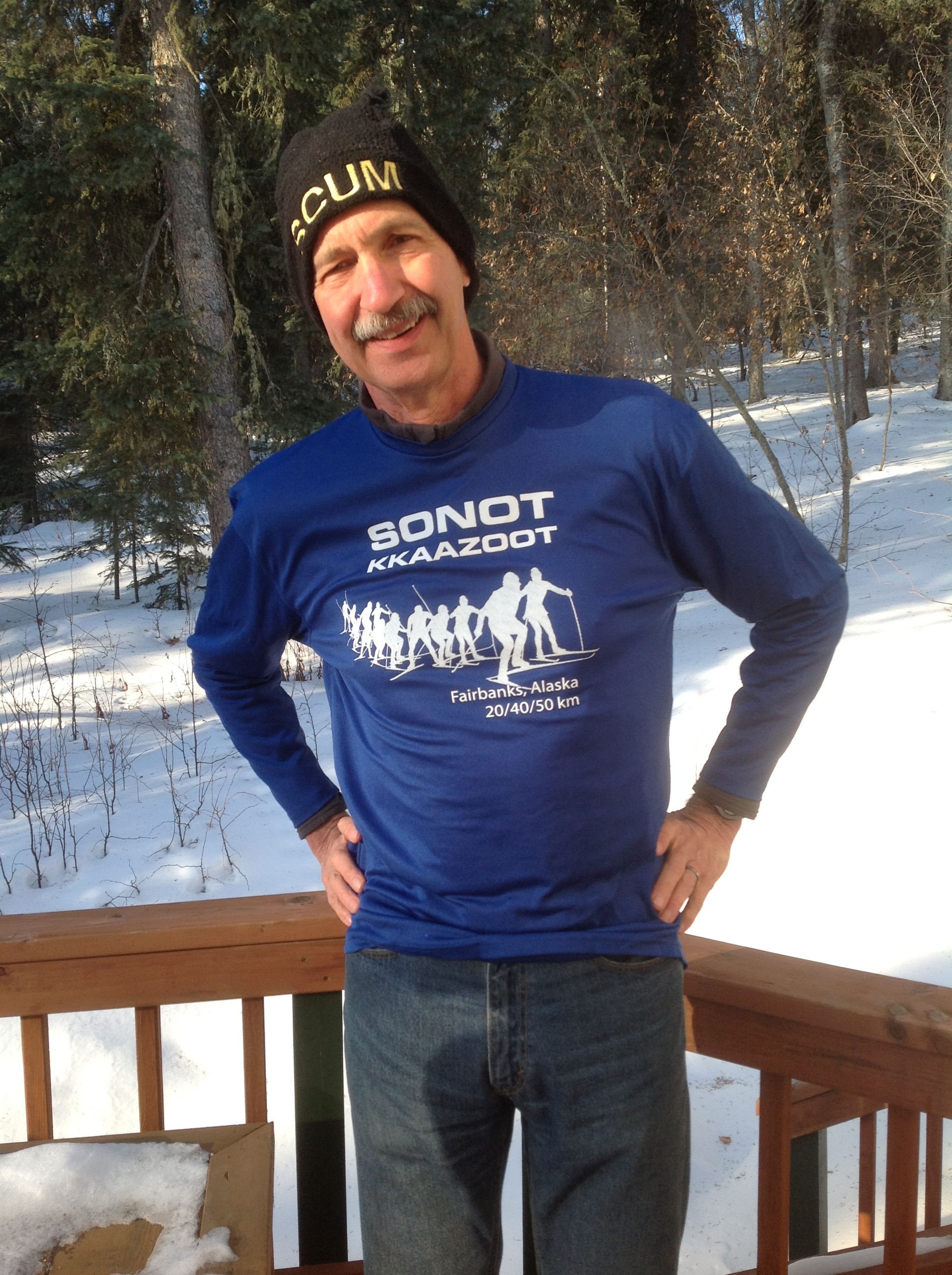 Technical fabric long-sleeved t-shirts and headbands with Sonot Kkaazoot design created by Fairbanks artist Dee Dee Hammond will be for sale at bib pick-up and at the Sonot Kkaazoot Awards Ceremony. The t-shirt modeled here by Frank Soos will be sold for $20 to race participants and volunteers; $25 for all others.