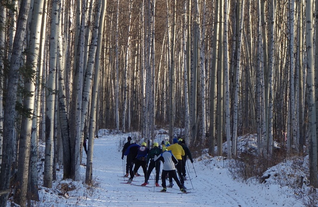 With the minimal snowpack after a very wet summer, the trails are not as smooth as they usually are. In some areas, ice lens have melted out leaving large divots, excess water runoff has created valleys next to water bars across trails, and leaves litter the compact snow surface. Thus, the first challenge is relearning balance on skis with fast snow conditions and obstacles. Although uphills may be an aerobic effort, the downhills are a stability challenge for the non-elite skier, adding a mental component to the early ski workouts. Thus, there are lots of opportunities to regroup and socialize as we did today.