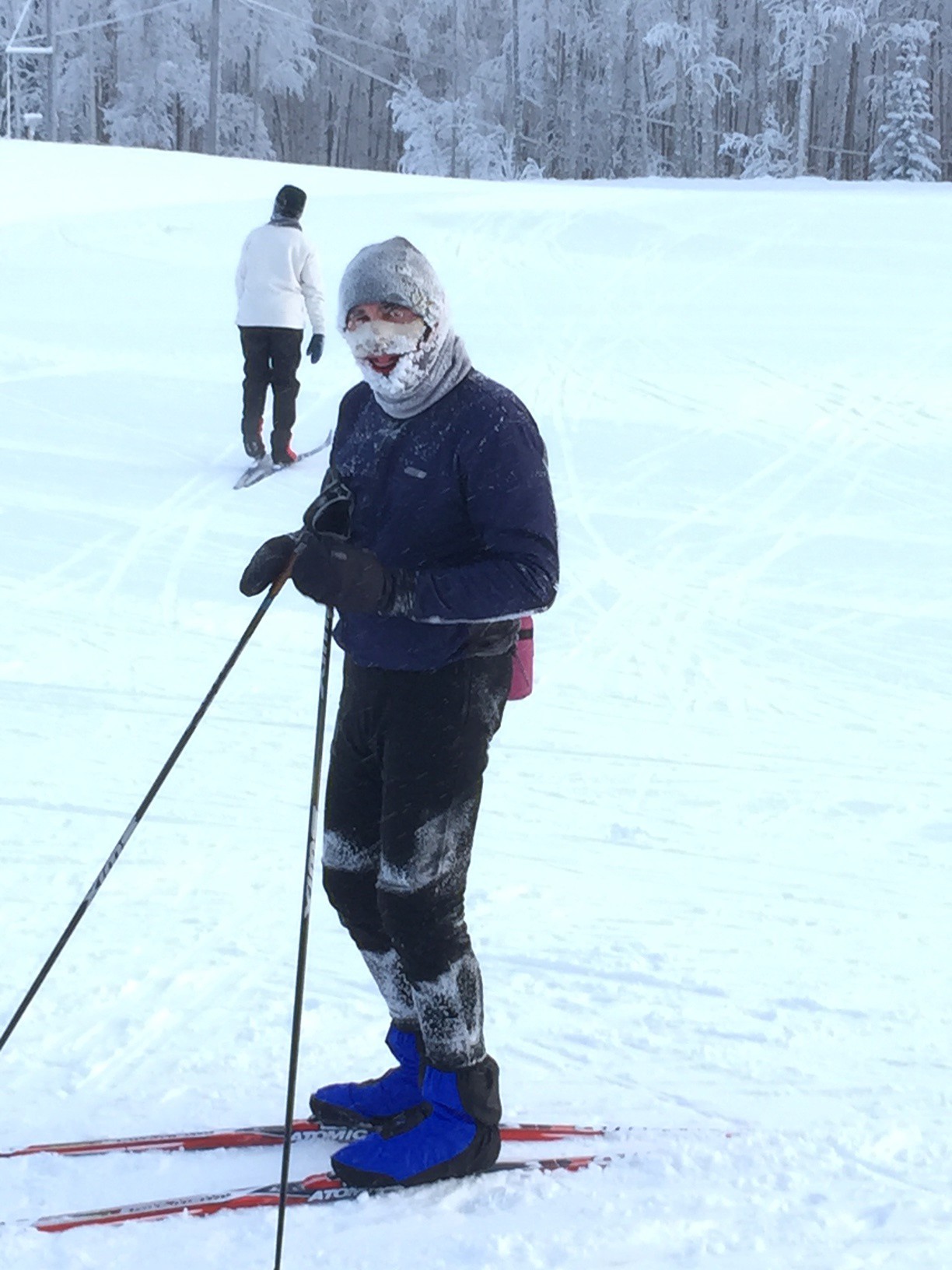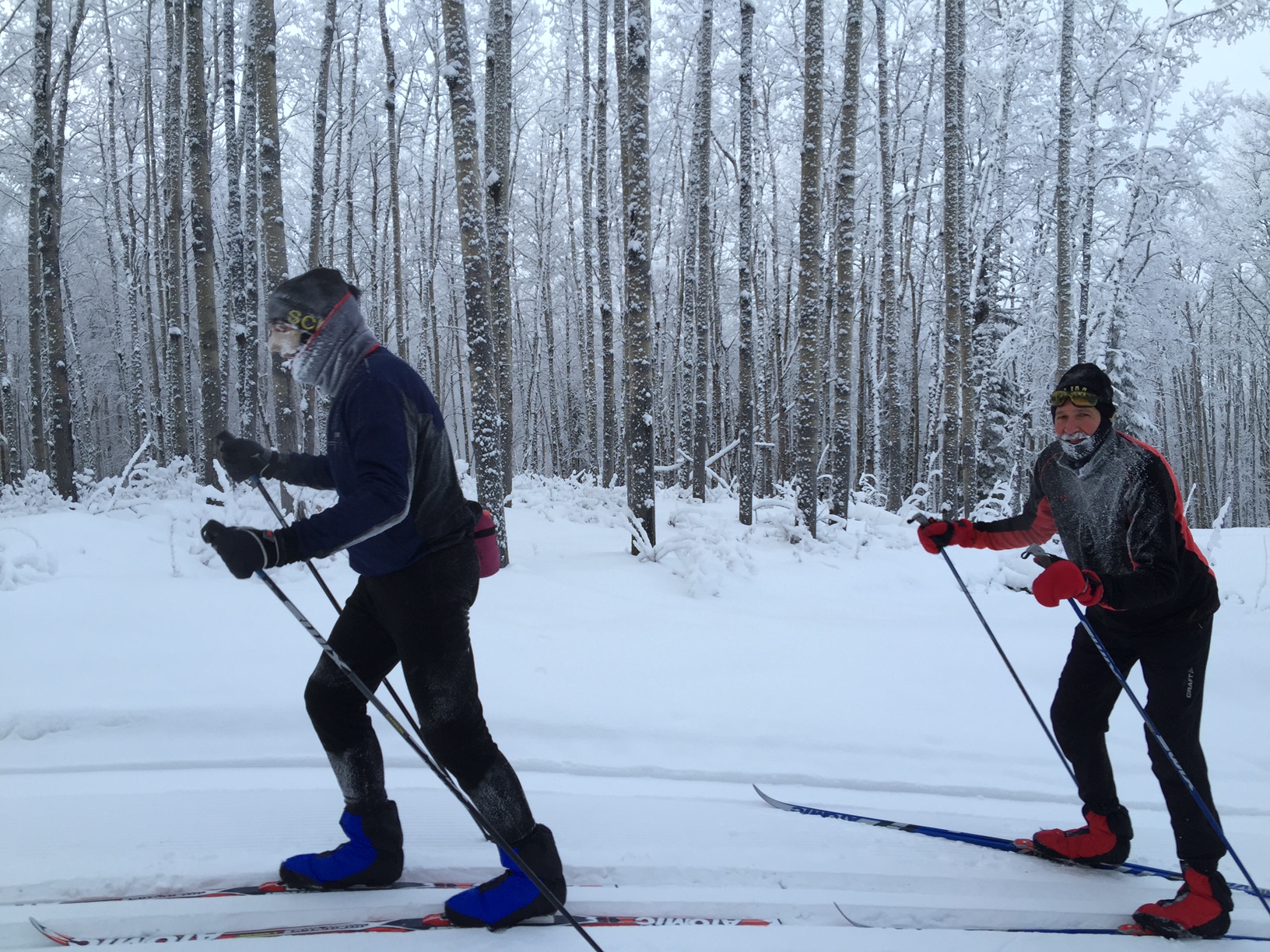 Winter weather finally arrived in Fairbanks, but thanks to the elevation of the Birch Hill Recreation Area, temperatures today were roughly 20 degrees warmer than the official airport temperature hovering around -20 deg F. Unfortunately, Friday night winds in excess of 25 mph toppled leaves, twigs, and birch seed onto the trails, and the classical tracks as the lowest depression in the trail surface collected the most debris. Several of the SCUM (Sonot Kkaazoot organizers) had attempted to ski at Birch Hill on Saturday and commented that it was more like hiking on skis.