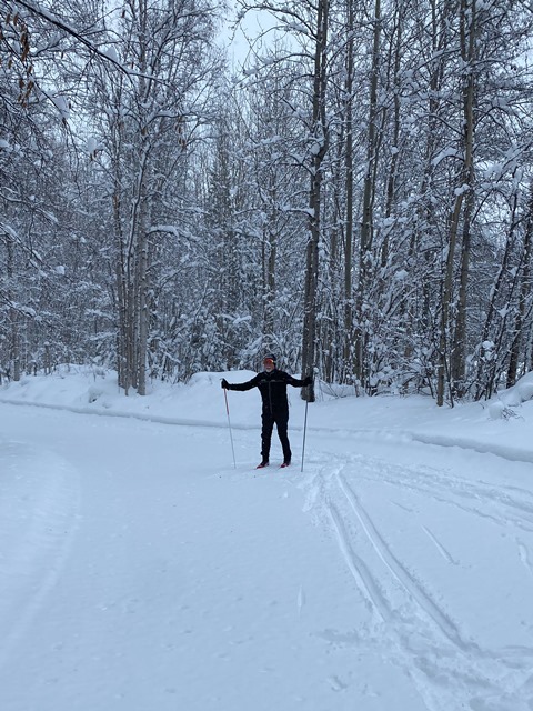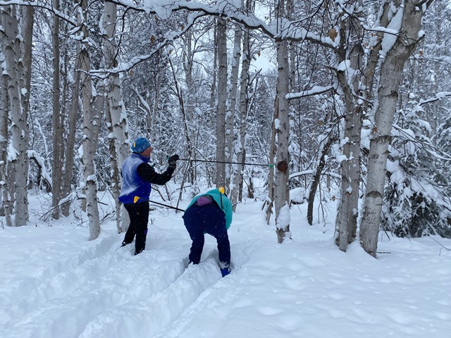 Once we got to the bottom of Cliffside and skied onto the Fort Wainwright alpine ski facility, we found newly groomed corduroy heading straight up the Fort Wainwright alpine hill to the left of the tubing hill. We abandoned the idea of skiing up the Sonot Connector (under a half foot of unpacked snow). Instead we skied up the right side of the FWW alpine hill like we did during the first decade of the Sonot Kkaazoot. Unfortunately, the grooming didn’t extend over to the top of the Sonot Connector, so we had some deep new snow to traverse.