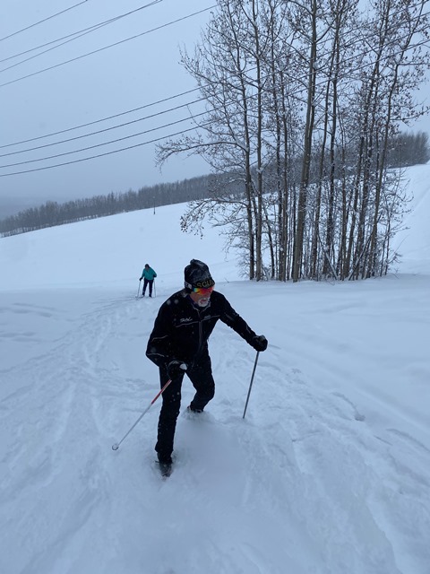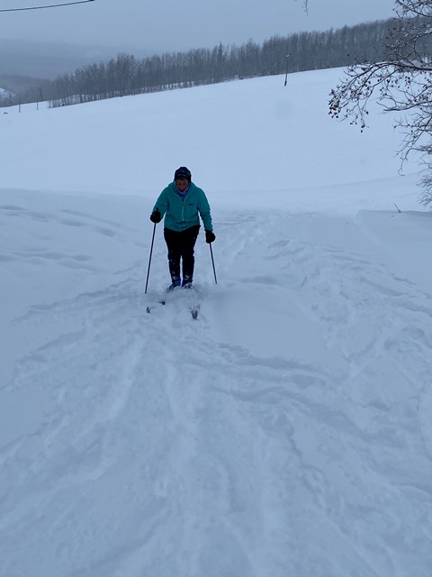 After checking out whether we could stay in the tracks on the downhill of the Blue Loop, we ventured out to the Sunnyside and Cliffside where were created rooster tails as we skied downhill.