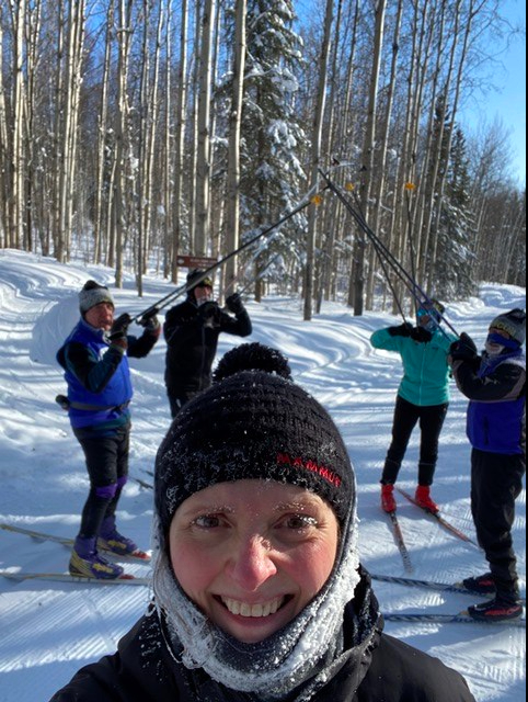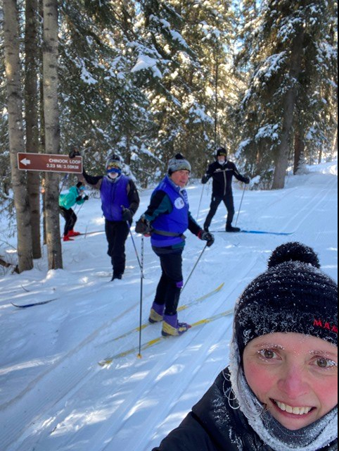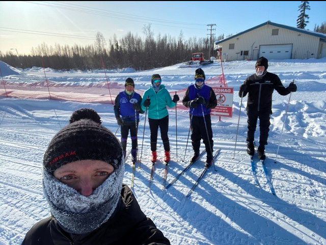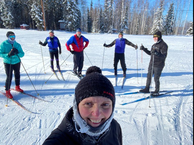 Being guided on our workout by one of the illustrious Nordic Ski Club of Fairbanks groomers meant that we were allowed to break some of the trail guidelines. To stay in the sun, we skied the Relay loop backwards, and then skied the Outhouse backwards until we intersected the Sunnyside and Cliffside Trails. After a quick descent in the set tracks, we all arrived at Fort Wainwright with chilly hands but still upright.