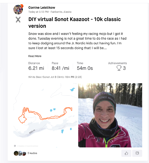 Even though Corrine wasn’t feeling her mojo and spent time dodging Junior Nordic skiers, she moves into the lead for the fastest Virtual Sonot Kkaazoot 10 km with a time of 54:00.