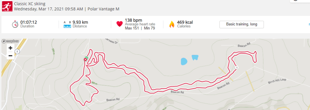 As the only female and oldest skier among those skiing today, I had the distinction of being the red lantern, but the SCUM were still in the finish area when I fnished with a time of 1:07:12, which included the time of getting mitts on and off to push my watch’s buttons.