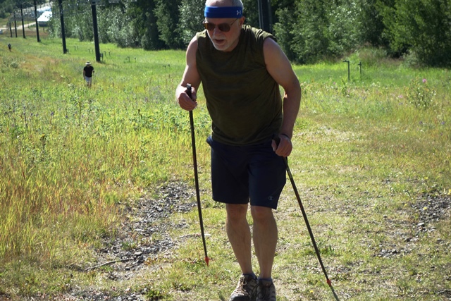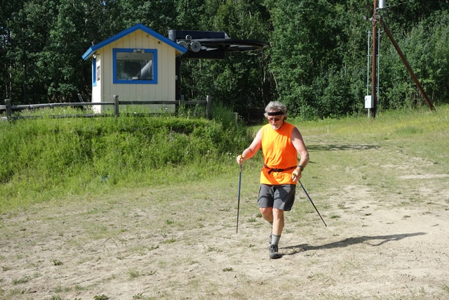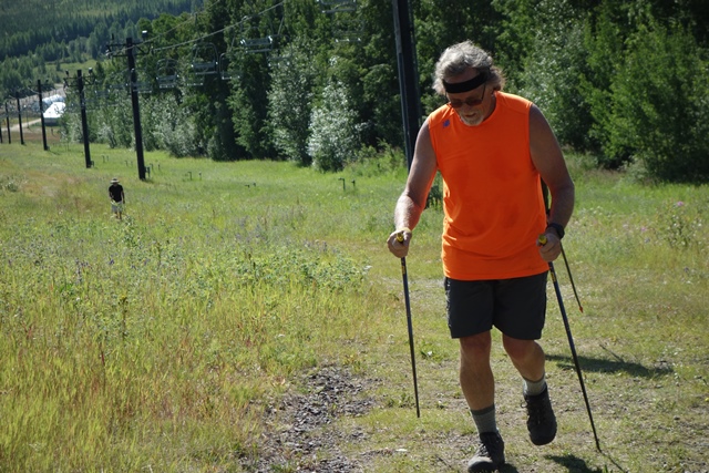Billl had dropped his poles midway up his 4th ascent figuring that he’d go back down to meet Carl after he’d finished his. However, Carl ended up a lot faster than Bill expected so three of us accompanied Carl on his last ascent. Meanwhile, Bill had to go further back down the hill to retrieve his poles and to finish 4 ascents WITH poles.