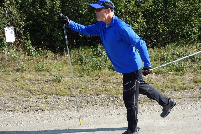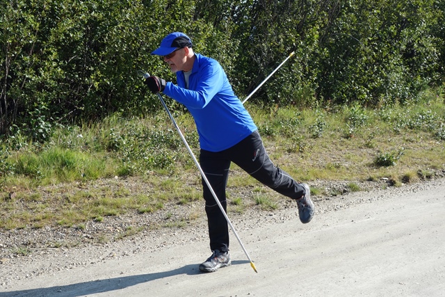 After Bernardo was duly reprimanded for not using his poles correctly, we asked Robert Hannon to demonstrate good technique. Robert was just returning to action after being on the SCUM disabled list for a painful hip. Here’s his demo with his right leg: