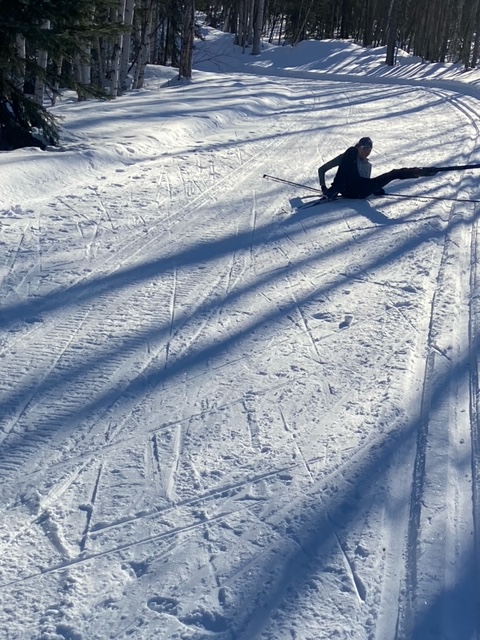 Joanna falls on White Bear trying to demonstrate how a high school skier tried to slow her down during the Sonot —photo by Bill Husby