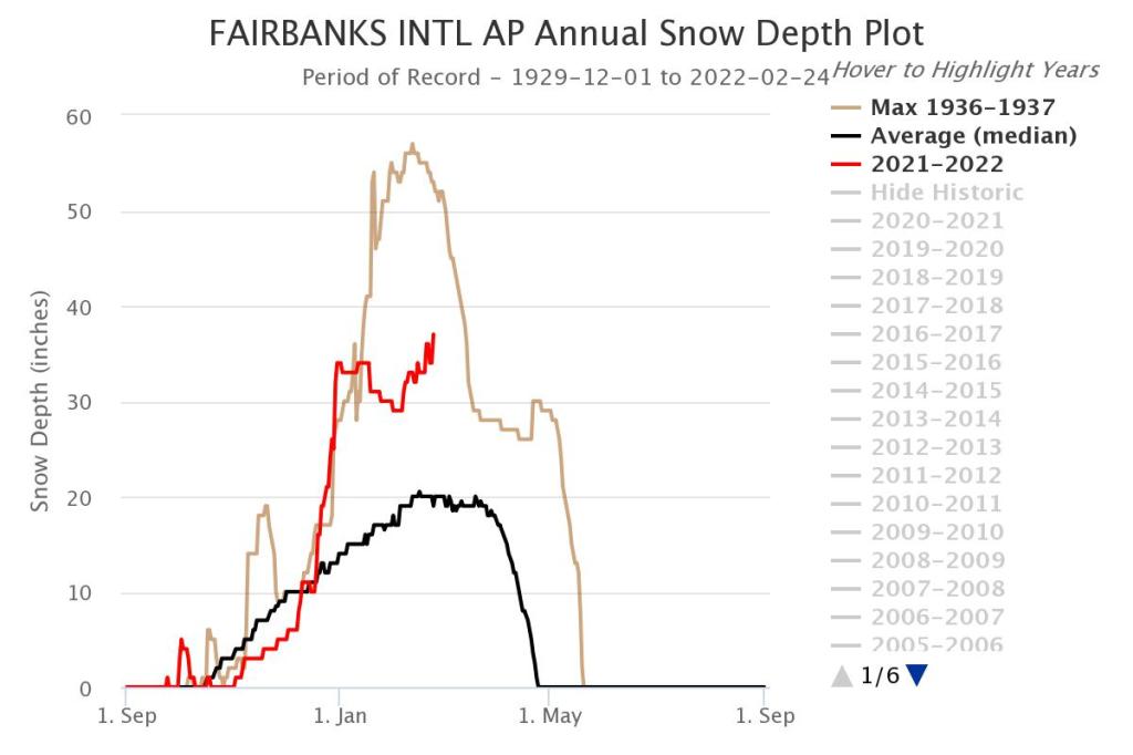 The National Weather Service Fairbanks posted this graphic on their Facebook page today. It indicates that we have the snowpack for great spring skiing, provided you contribute to the trails fund so that the groomers can continue to buy diesel for the Pistenbully.