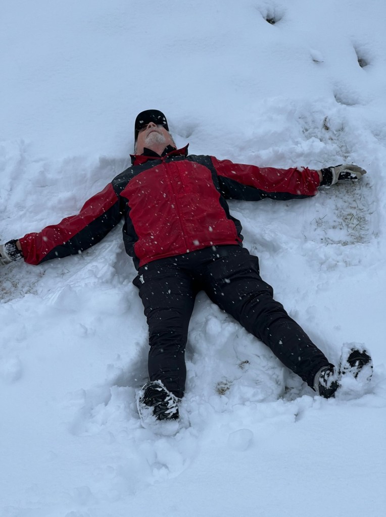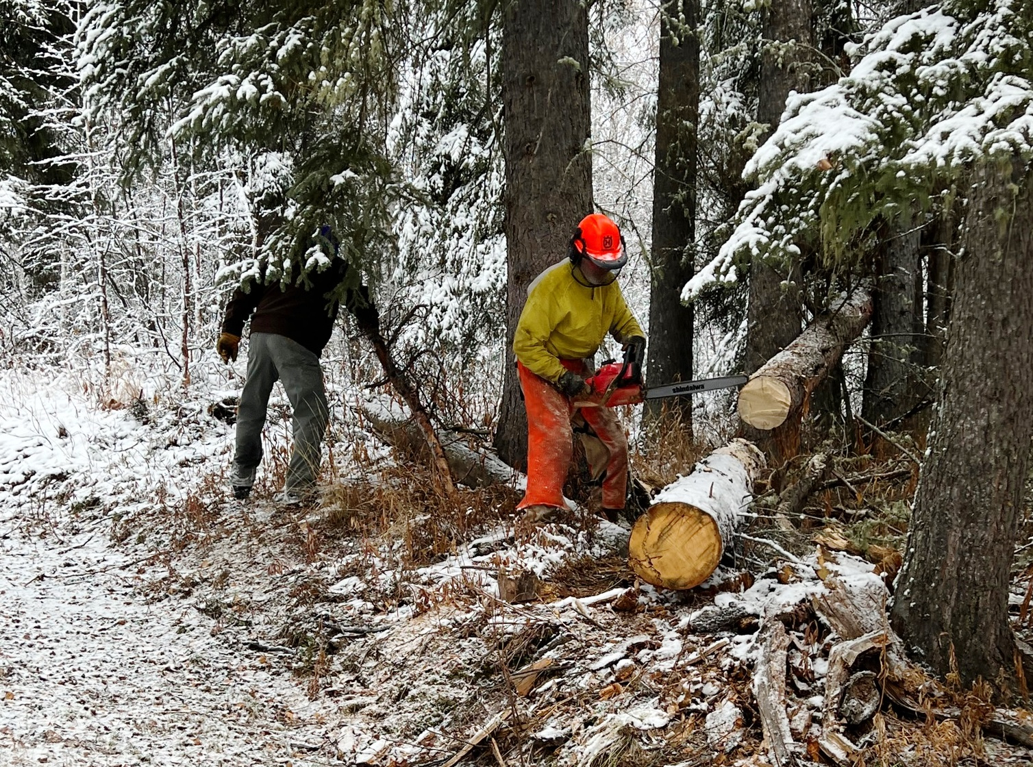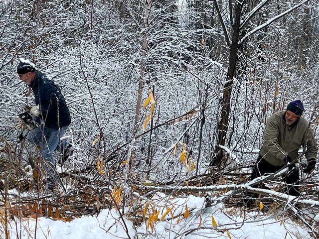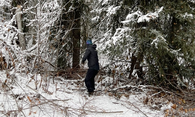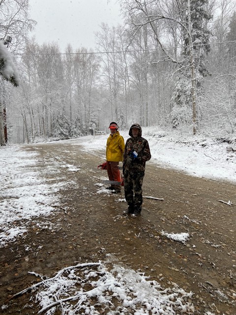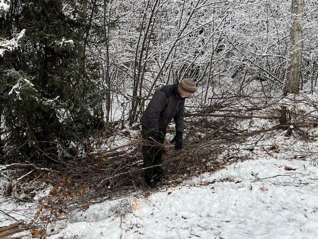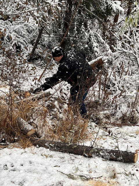 Dermot was attempting to do brush hazard removal, but the snow was still sticking to the branch: