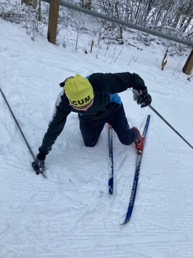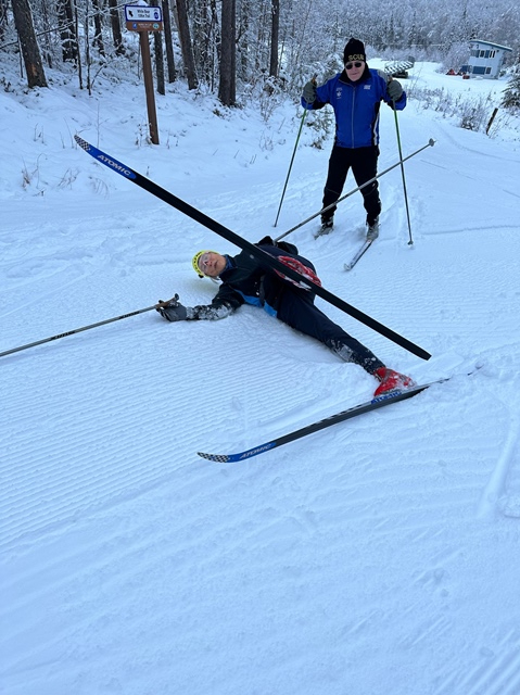 I didn’t need to get beyond the Warm-up Loop to have my first fall, which my friends rushed to document. It was practice for the falls I would do throughout the morning as I attempted to remove fallen branches while skiing: