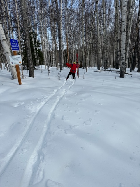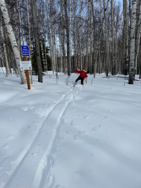 After finishing White Bear (and Moilanen Meadows, which hadn’t been groomed in over a week), we noticed that Sidewinder had been groomed. Thus, we headed down Sidewinder with the goal to ski the down to Big Surprise Cutoff and then back up on the sprint loop. However, one of our M10 SCUM had a little bit too much speed on one of the key downhill corners, so took the route less traveled.