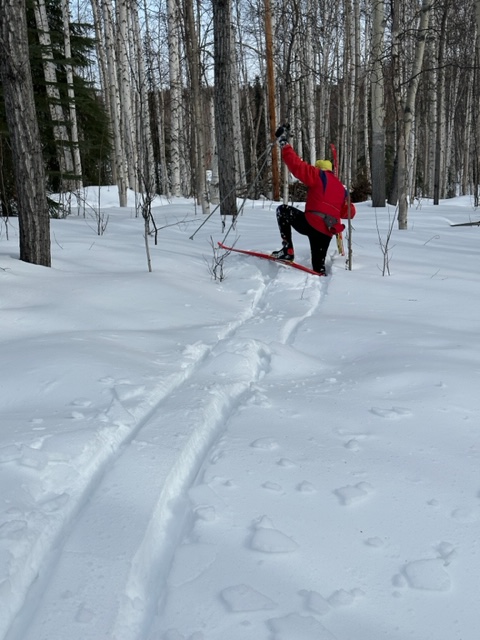 The snow on this route was a little too deep for Don to execute his previously demonstrated kick turn, so he removed his skis for his retreat, which all his fellow SCUM were able to enjoy, including Greg who finally found us.