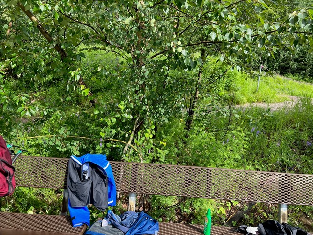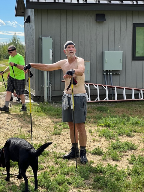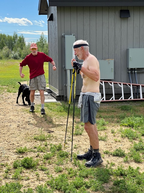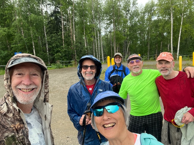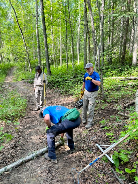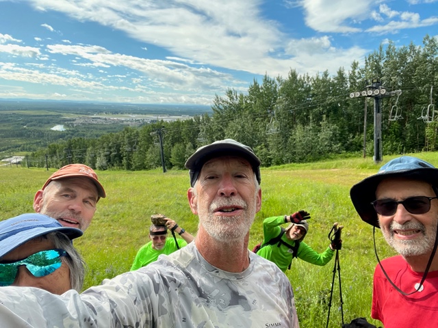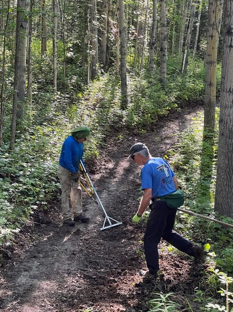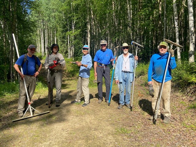 The Nordic Ski Club of Fairbanks has a Recreational Trails Program (RTP) Trails Maintenance Project grant to improve many of the trails at Birch Hill Recreation Area and on Fort Wainwright. The Happy Trails crew had completed grading and smoothing work with their mini dozer, but additional hand raking and root and brush lopping was needed. Because the contract billing deadline is 31 July 2023, the SCUM work party set off early today on the hottest weekend of the summer to provide some of the required volunteer match work.