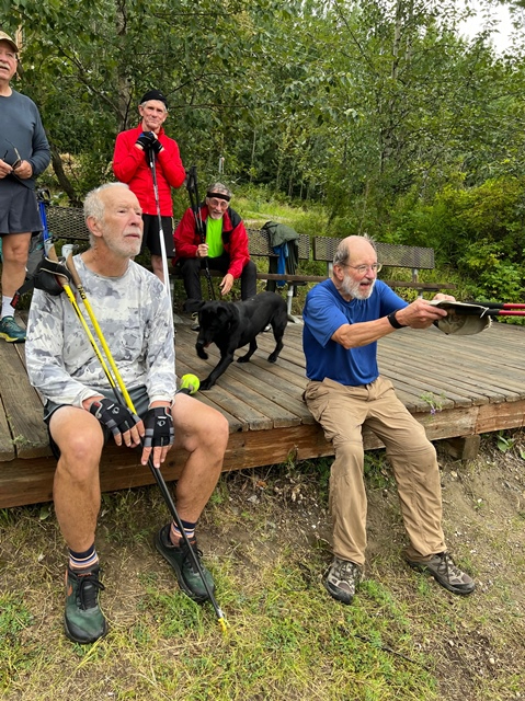 With temperatures in the low 50s, drizzle, and a nice breeze, four ascents of the FWW alpine hill (750 m total climb) was easily done by the SCUM today. With the hill fully mowed and the air free of wildfire smoke, we could chat as we ski walked. Lola was the only one to do fartlek ball chases during her ascents: