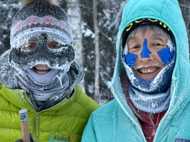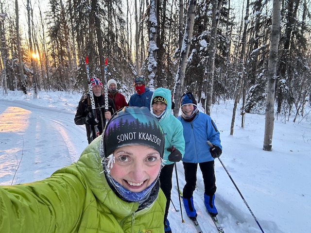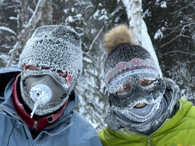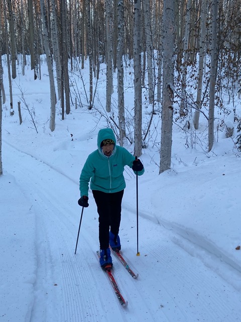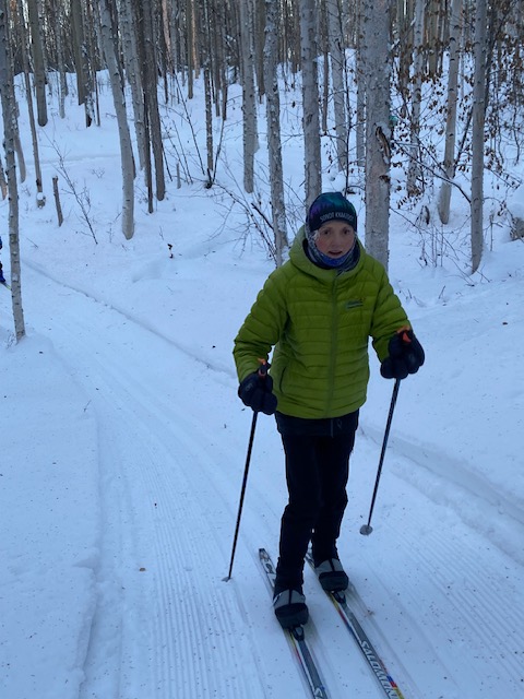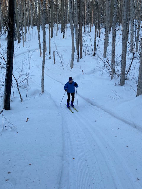 With the cold temperatures, the corduroy and deep tracks remain pristine except for the abundant birch seed and spruce cones that have been deposited on the trails. Air quality was moderate according to the Purple Air station at Birch Hill, so our workout did more good than harm to our aging carcasses.