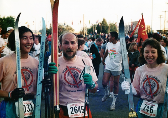 Before there was SCUM, there was Team Brain Dead. In the late 80s, when winter temperatures were colder, Team Brain Dead was formed to celebrate those hardy skiers who would continue their workouts regardless of temperature. They had t-shirts made when they ran the 1990 Midnight Sun Run on skis, extending their ski training range from -48 deg F to +68 F deg, a 110 deg range:
