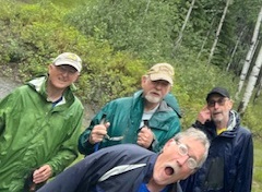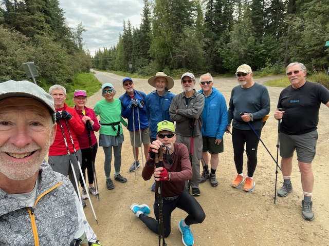 Eleven SCUM, all over 70 years old (except for newly retired Dave in center front) with at least one physical or mental handicap, made it up 5 km with 460 m of climb and an equal distance of elevation loss today. Like Alaska Senior Games, we allow youngsters who are at least 50 years old to play with us.