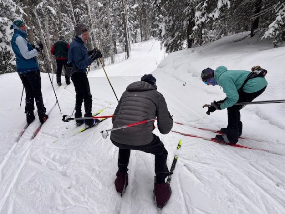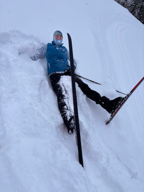 Today we plodded on our classical skis with 3 inches of new snow in the tracks that were set just Friday. On Sunnyside and Cliffside, one had to be careful to stay on the packed trail as the snow on the edges was deep. Sarah discovered that the hard way on one of the downhill switchbacks on Sunnyside.