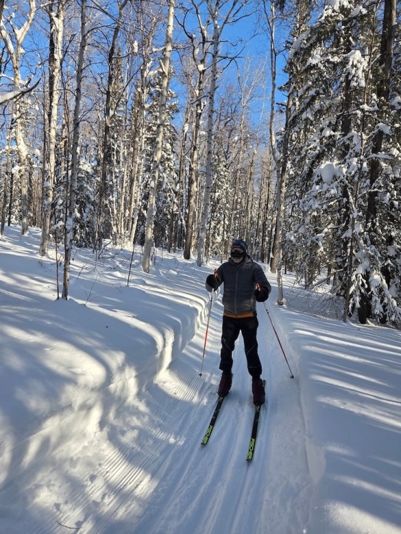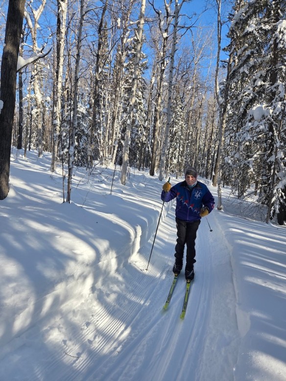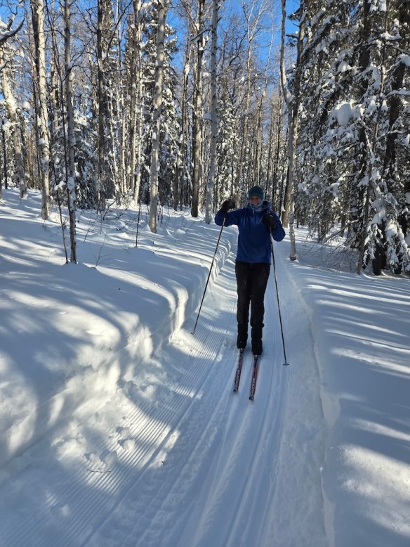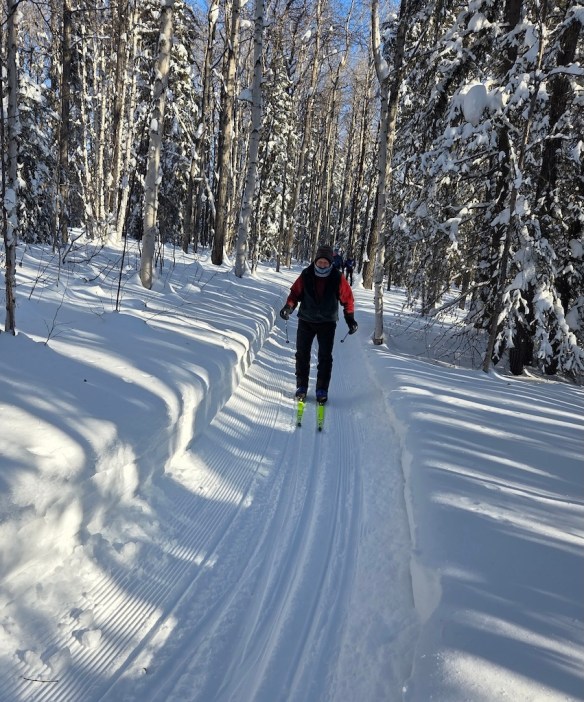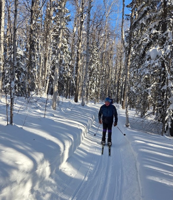The sun was out and it was -6 deg in the Birch Hill stadium. With the classical only trails groomed yesterday, the SCUM headed out to the Blackhawk trail to enjoy Bill Husby’s grooming. We were treated to fresh new tracks except where a moose (untrained in trail etiquette) had disrupted the parallel grooves.
