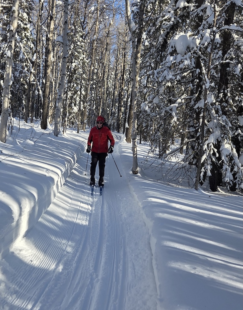 The sun was out and it was -6 deg in the Birch Hill stadium. With the classical only trails groomed yesterday, the SCUM headed out to the Blackhawk trail to enjoy Bill Husby’s grooming. We were treated to fresh new tracks except where a moose (untrained in trail etiquette) had disrupted the parallel grooves.