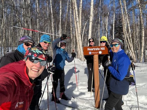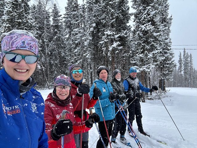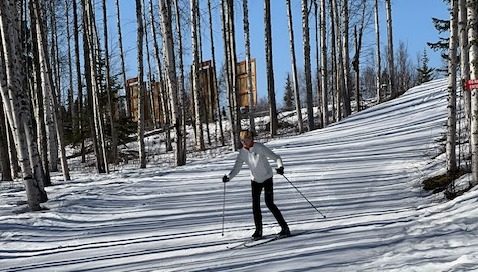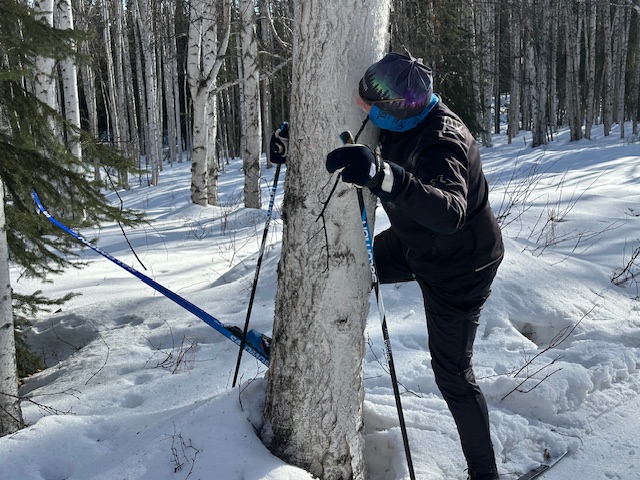 Thus, Wednesday SCUM workouts will officially move from Birch Hill to Ester Dome starting 30 April 2025. We’ll start from the bike trails parking lot on Ester Dome Road (roughly one mile above St. Pat’s Road) at 10 a.m. The general plan is to ski walk down to St. Pat’s Road from the bike trails and then ski walk up to Ullerhaven for a 5 km uphill ski walk and then walk back down (2 miles) to our cars. Starting out, you could just start ski walking uphill (like we did today) and you can turnaround whenever you feel like you’ve done enough or have to get back to work.