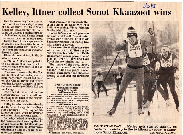 A total of 23 skiers competed in the 50-km race, and another 8 in the 20-km event. As the Fairbanks News-Miner reports, “the first Sonot Kkaazoot cross-country ski races came off without a hitch Saturday, with Tim Kelley and Dexter Ittner posting victories in the two races.”