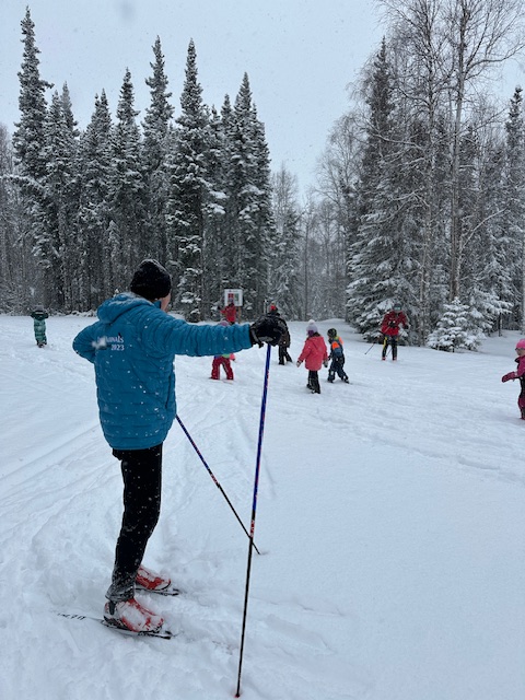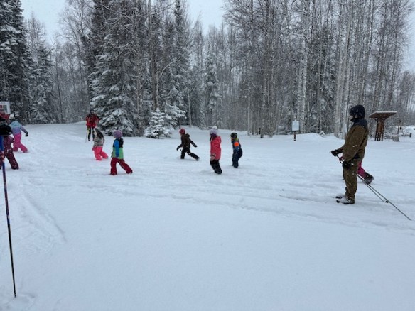 A busload of kindergarteners and first graders arrived on skis (no poles needed) as we were leaving, excited to have fresh snow approaching some of their knees.