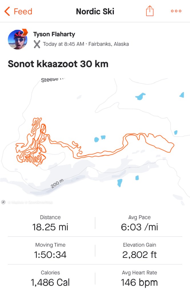Michael Angaiak celebrated finishing Kristen Rozell’s Sonot Kkaazoot Training Class by skating the 30 km virtual Denali State Bank Sonot Kkaazoot in 2:36:02. He was a little late in sending in his results, but his report was so upbeat and complete, it’s wasn’t much work to post.