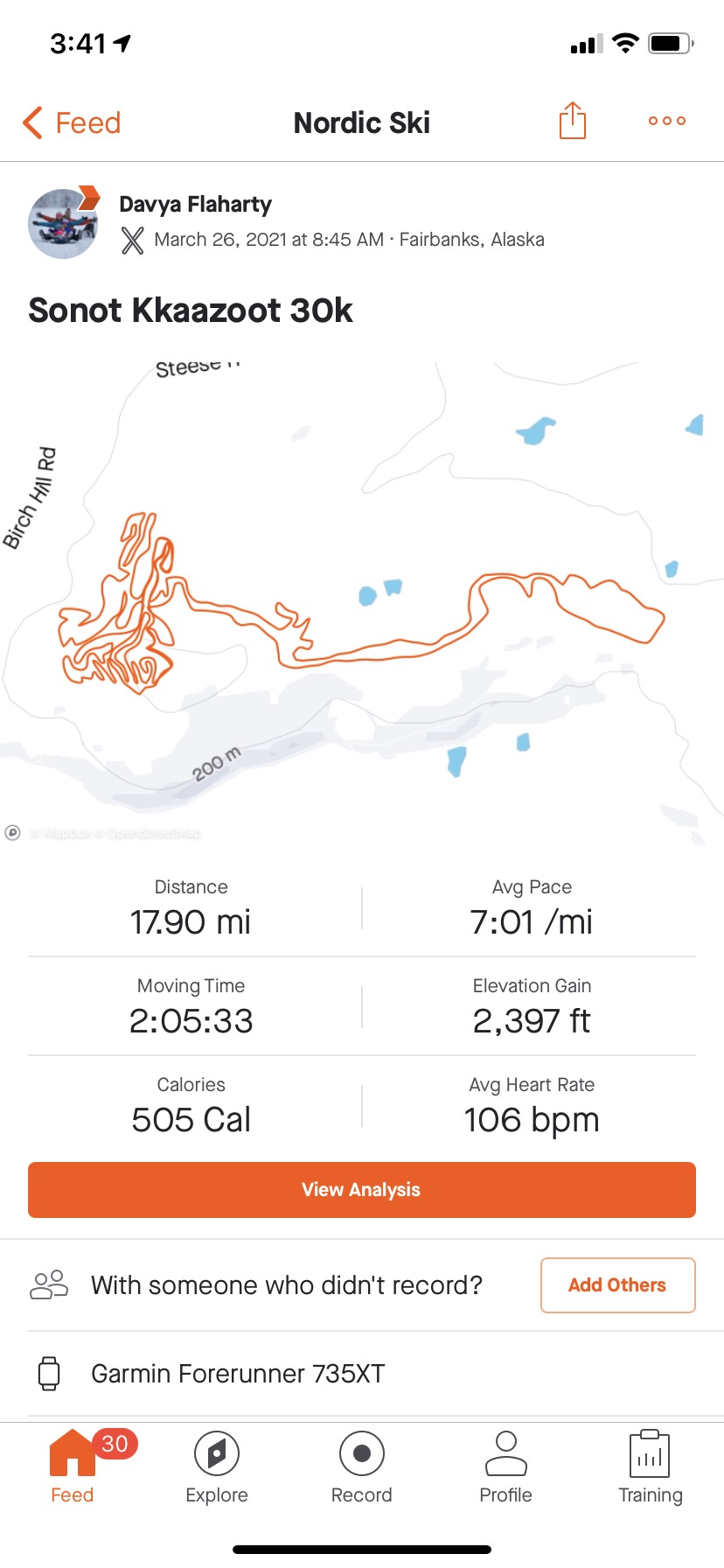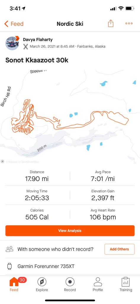 Description: My first Sonot Kkaazoot experience! I had taken Kristen Rozell’s Tuesday night “Train for the Sonot Kkaazzoot” class last spring only to have everything canceled, so I was excited to take her class again this spring. I didn’t V2 nearly as much as we practiced, without the river portion this year, but my technique sure has improved! A number of us from class started the race together on Sunday morning so I appreciated the extra motivation. I felt better over the last 20 k then the first 10 k as it warmed up a bit. Perhaps the adrenaline rush from the moose that crossed in front of me at the end of Relay was what helped me pick up the pace! Big thanks to Kristen and all of the teachers from NSCF for the wonderful variety of excellent class offerings for all levels. I’m looking forward to building up to the 50 k next year!”