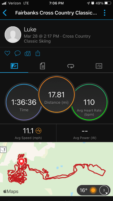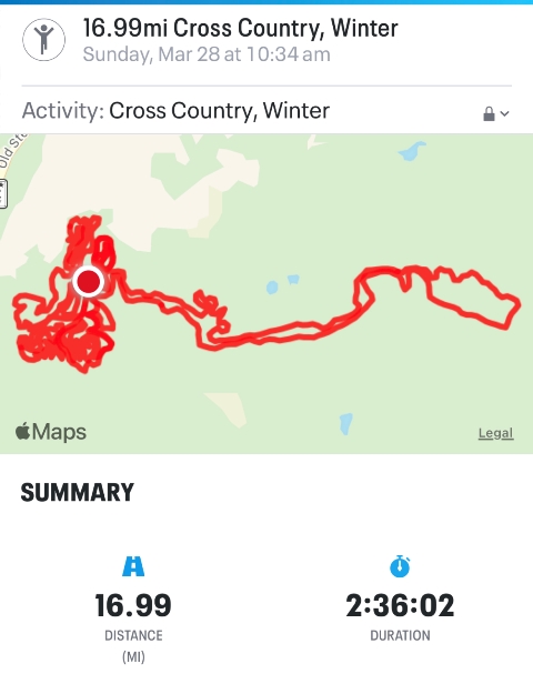 Time: 2:36:02 (I’m confident I skied the full correct course but the “Map My Fitness” app I used on my phone only lists 16.99 miles. Hmm…)