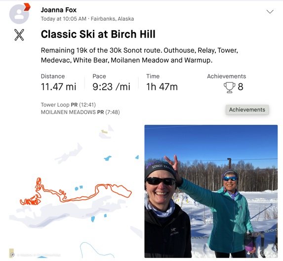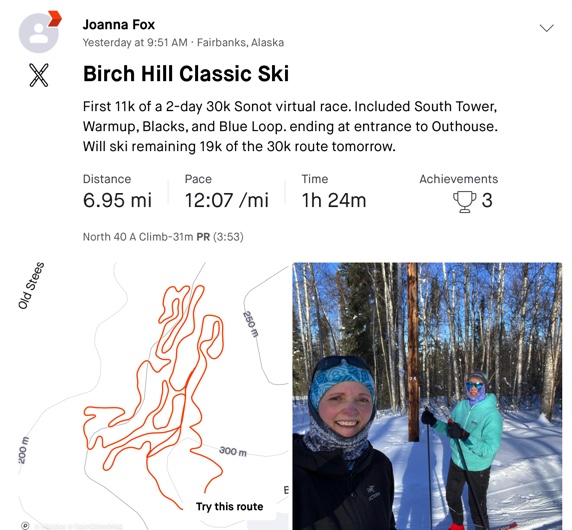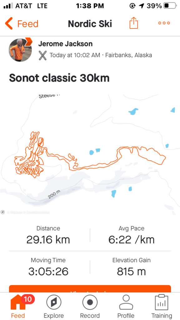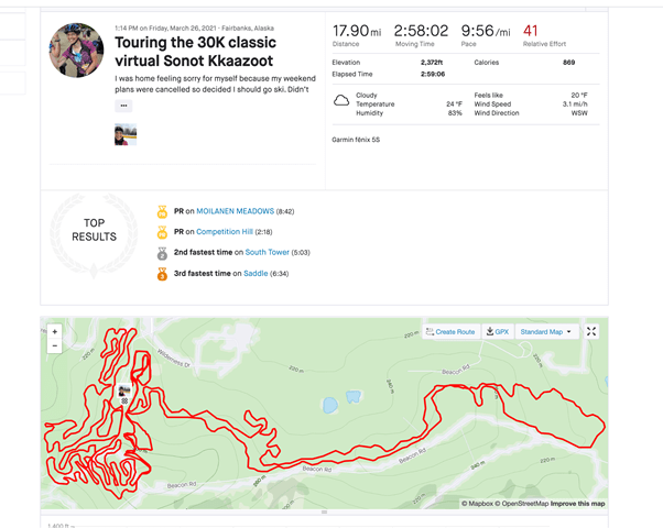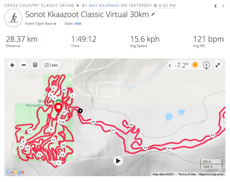 Saturday morning, Dan Johnson skate skied his 30 km virtual Denal State Bank Sonot Kkaazoot in an official time of 2:43:38.