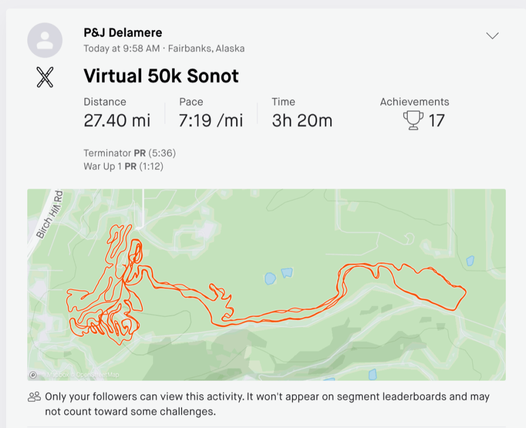 Bob Toth finished his virtual 50 km Denali State Bank Sonot Kkaazoot on 6:59:42. Bob commented that he was “skiing with skate gear doing my unique and possibly inimitable Free (of anything approaching) Style ‘technique.”