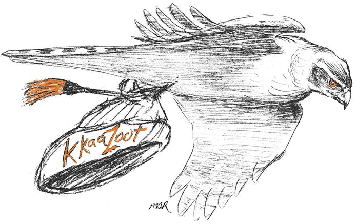 Illustration by Mark Ross, who notes that an adult goshawk has red-orange eyes–very appropriate for the Sonot Kkaazoot