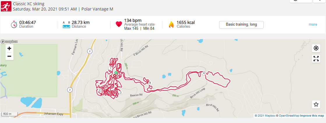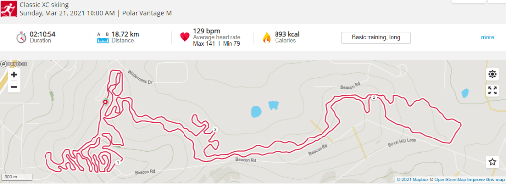 To make sure that he was going to ski his virtual 90 km of Sonot Kkaazoot courses over the widest possible trail conditions, Bill Husby skied his virtual 50 km classical Denali State Bank Sonot Kkaazoot in three installments for a final official time of 4:37:08 (corrected at 2322 on 3/21/21). Total distance was 49.44 km.