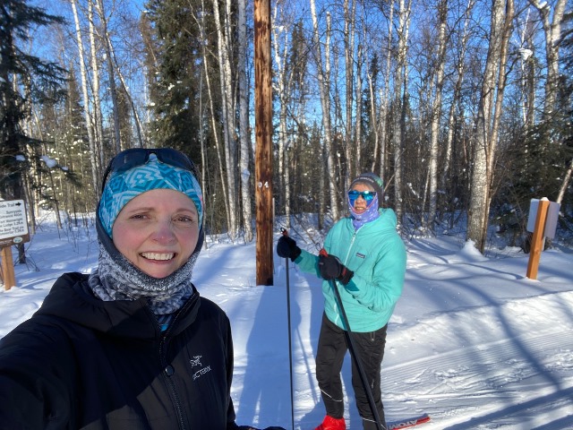 On Saturday, she skied the 30 km course, where Joanna Fox kept her company for the first 11 km as they chatted and noticed that the black loops were enjoyable at their leisurely pace. After the blue loop, Joanna called it a day and took the requisite selfie of us at that point.