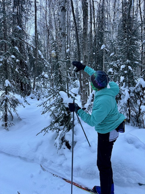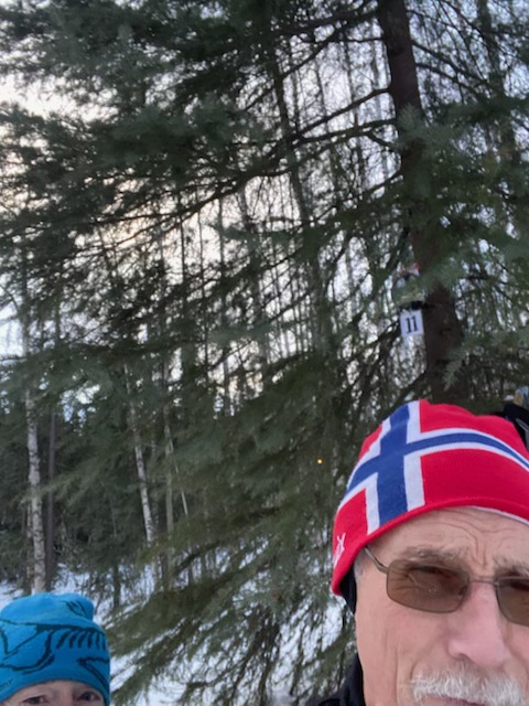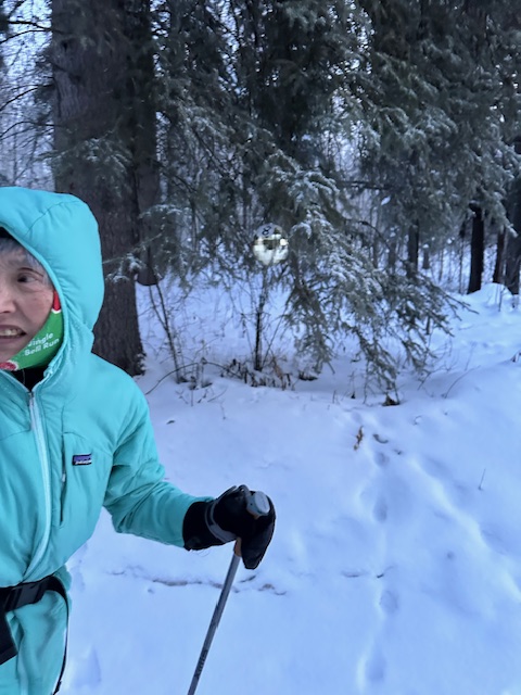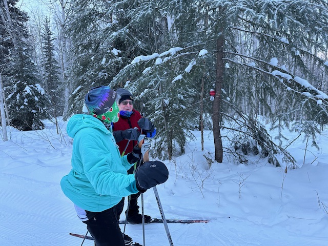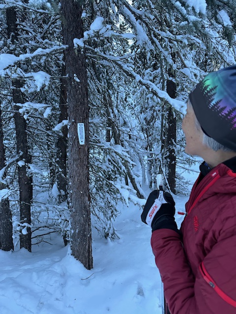 Even on a cold day, Bill’s tracks were a delight as on the N40, you could glide entirely up the uphills after tucking the downhills in the tracks. It was also possible to stride up the Competition Loop in Bill’s clean and deep tracks. As we were finishing up, the grooming crew was heading out the blue loops so likely by now they have new clean tracks, too. The Outhouse Loop really needed new tracks after the recent winds had filled the tracks with balsam poplar leaves.Today was a good day to not be skiing on skins as you enjoyed more free glide.