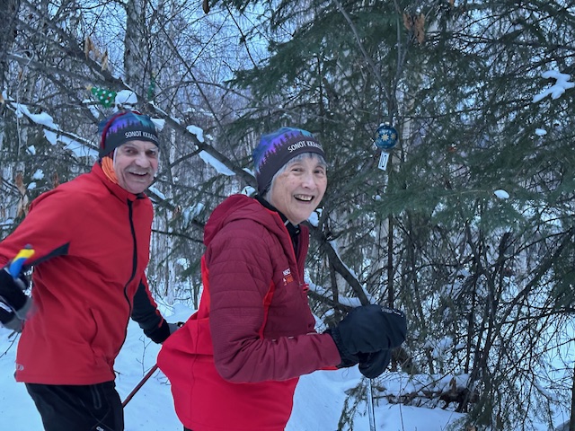 On the fifth day of Christmas, some the SCUM were a little weary having skied 100 minus their age in kilometers on Saturday, or the age of her oldest child in kilometers. So, we skied slowly in search of the three LOL ornaments we hadn’t located.