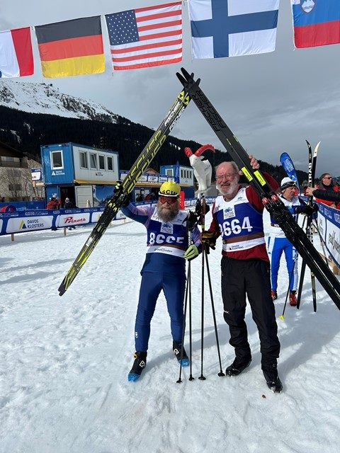 Chris Puchner and Mike Schmoker celebrate their 10 km CL finish at Klosters Masters World Cup–photos by Margaret Mannix