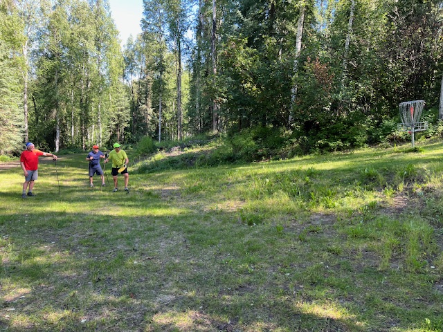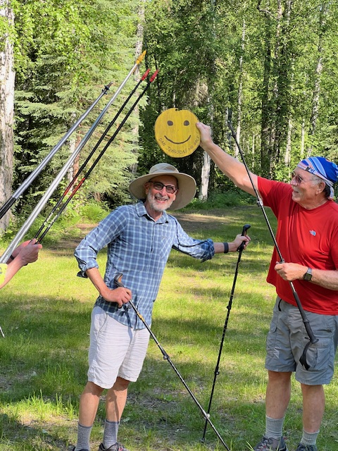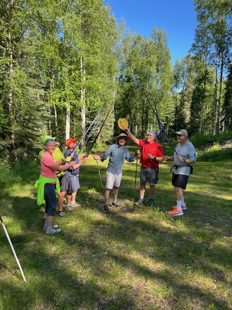 Today the SCUM opted out of doing the Fort Wainwright alpine hill ascents since several of us plan to do the Golden Heart Trail Run tomorrow. Instead, we ski walked the black and blue loops and finished with some disc golf. However, in honor of the Plastic Free July Challenge, we used a wooden disc. Here is a close up of the disc and Bernardo who ended up tossing the disc the closest to the goal: