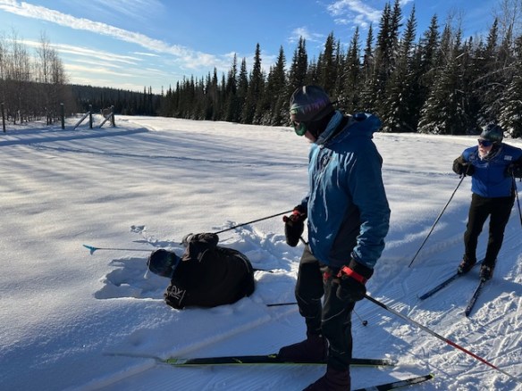 With cold temperatures and very little snowpack on the trails throughout the Fairbanks North Star Borough, the SCUM need to be resourceful to find snow that geezers with broken body parts can safely ski. Although counterintuitive, the black loops have been less skied so the trails had a little forgiveness in them in the form of untracked snow. Today the “no Y SCUM” outnumbered the male ones. Nobody fell but Mom, but she’s learning to get up more quickly.