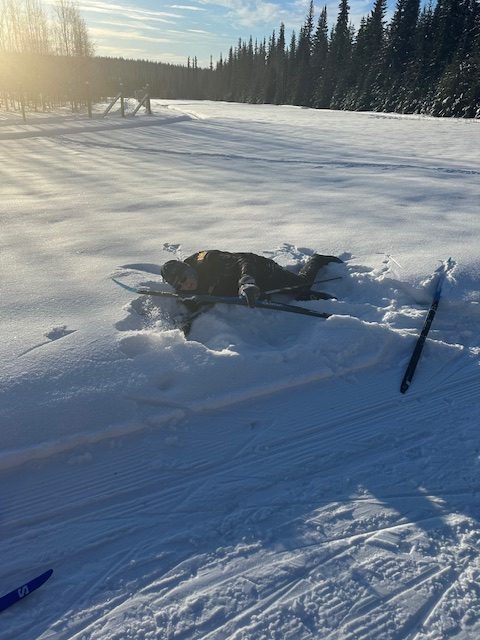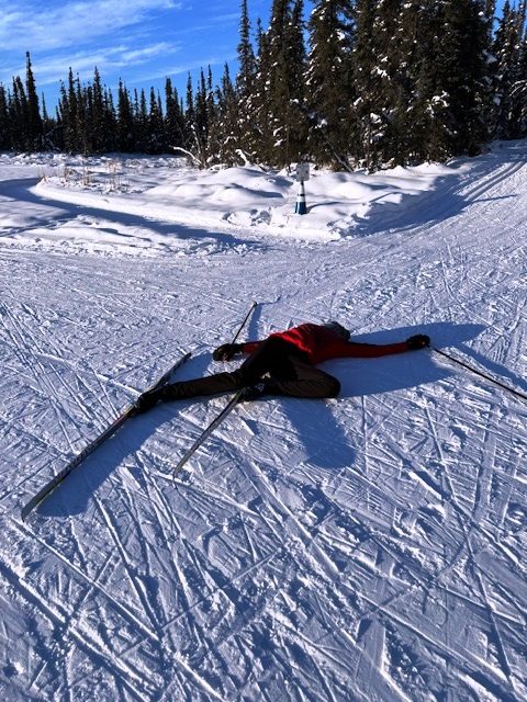Joanna collapses at the finish of the Double Theta (skiing two figure 8s on Smith Lake)–photo by Bill Husby