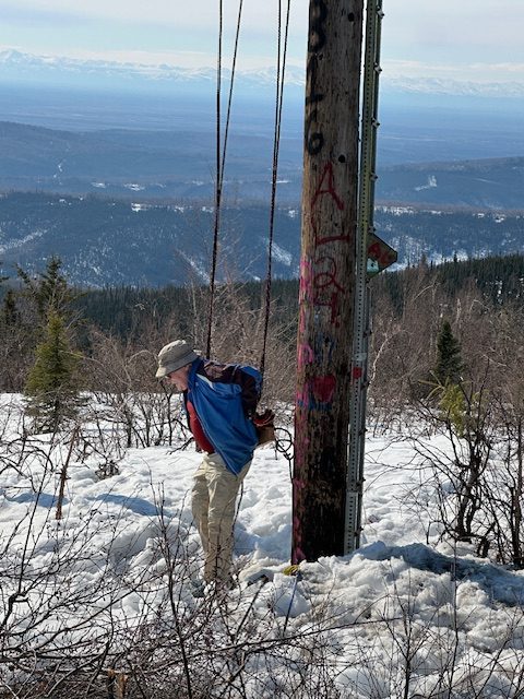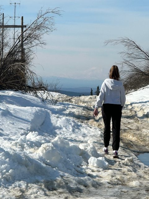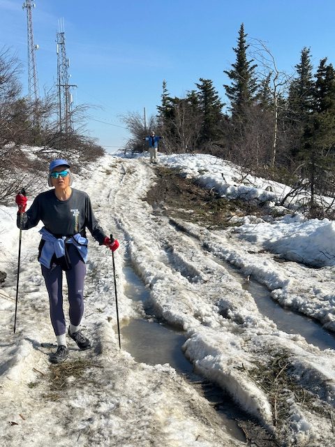 Thus, Wednesday SCUM workouts will officially move from Birch Hill to Ester Dome starting 30 April 2025. We’ll start from the bike trails parking lot on Ester Dome Road (roughly one mile above St. Pat’s Road) at 10 a.m. The general plan is to ski walk down to St. Pat’s Road from the bike trails and then ski walk up to Ullerhaven for a 5 km uphill ski walk and then walk back down (2 miles) to our cars. Starting out, you could just start ski walking uphill (like we did today) and you can turnaround whenever you feel like you’ve done enough or have to get back to work.