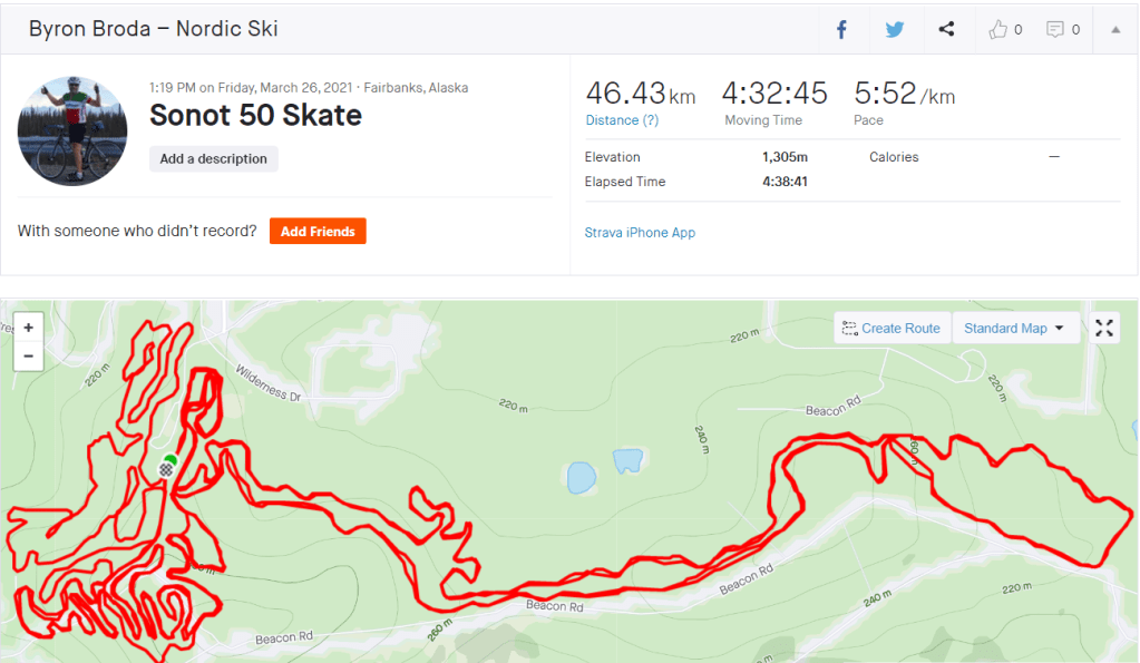 Race organizer, Bad Bob Baker and Sharon Baker completed their virtual 50 km Denali State Bank Sonot Kkaazoot on Sunday. Bad Bob’s time was 3:41:27 and Sharon’s time was 3:39:10. By successfully skate skiing the 50 km Sonot Kkaazoot, the Bakers became the first skiers to skate ski the 90 km Sonot Kkaazoot hat trick. The other mere mortals had to classical ski some of their virtual Sonot Kkaazoot courses.