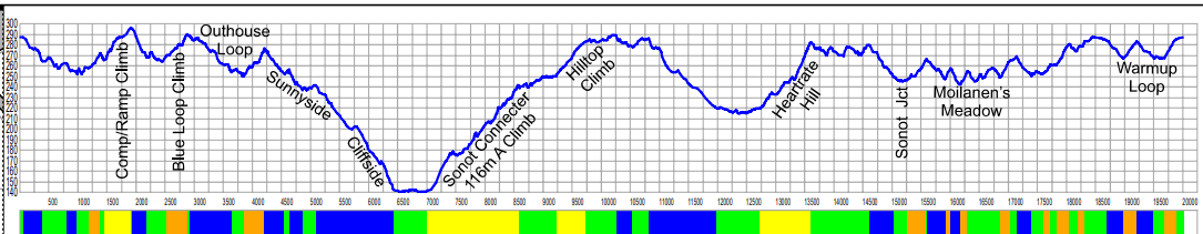 The last 20 kilometers of the Sonot Kkaazoot are particularly challenging as a skier faces the Sonot Connector (a 116 m long A climb) with 37 km of skiing already on one’s legs. That climb is followed closely by the Hilltop (33 m A climb) and Heartrate Hill (65 m A climb) as the skier skis White Bear for the second time.